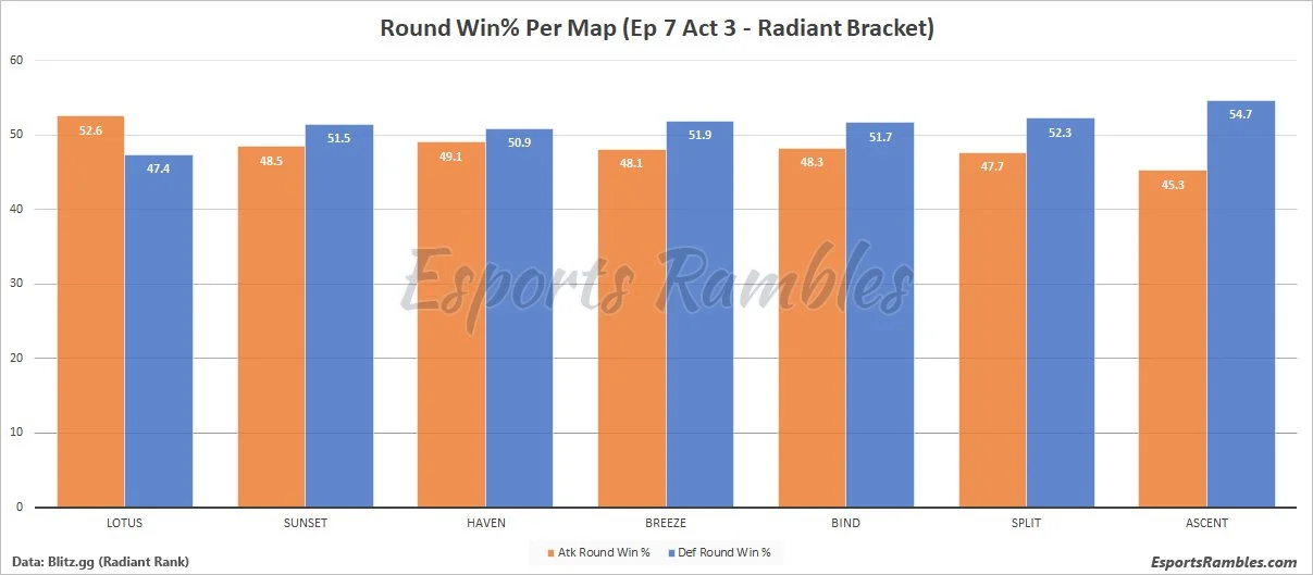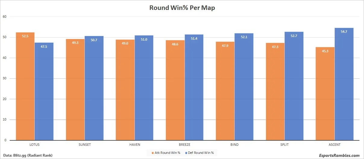 As you can see that even though the game is going to be defender sided most of the time. A map like Split or Ascent tends to favor them a lot more than the other maps but, there’s also Lotus in the map pool where the attacker side seems to win more rounds which is not a common thing to see.